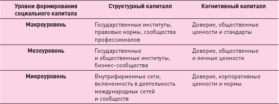Различают две формы социального капитала – структурный (сети, ассоциации, институты, а также правила и регламенты, которые регулируют их функционирование) и когнитивный (отношения, нормы, поведение, разделяемые ценности, доверие).