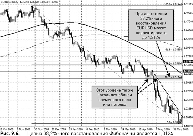 На рис. 9.6 показано, что нормальная 38,2 %-ная коррекция Фибоначчи поднимет EURUSD с 1,1876 до 1,3124 (заштрихованная область). Это просто минимальная нормальная коррекция, которая рано или поздно произойдет. И хотя размер ее кажется настолько большим, что его почти невозможно себе представить, но это дело рынка, а не ваше – определять возможность того или иного движения.